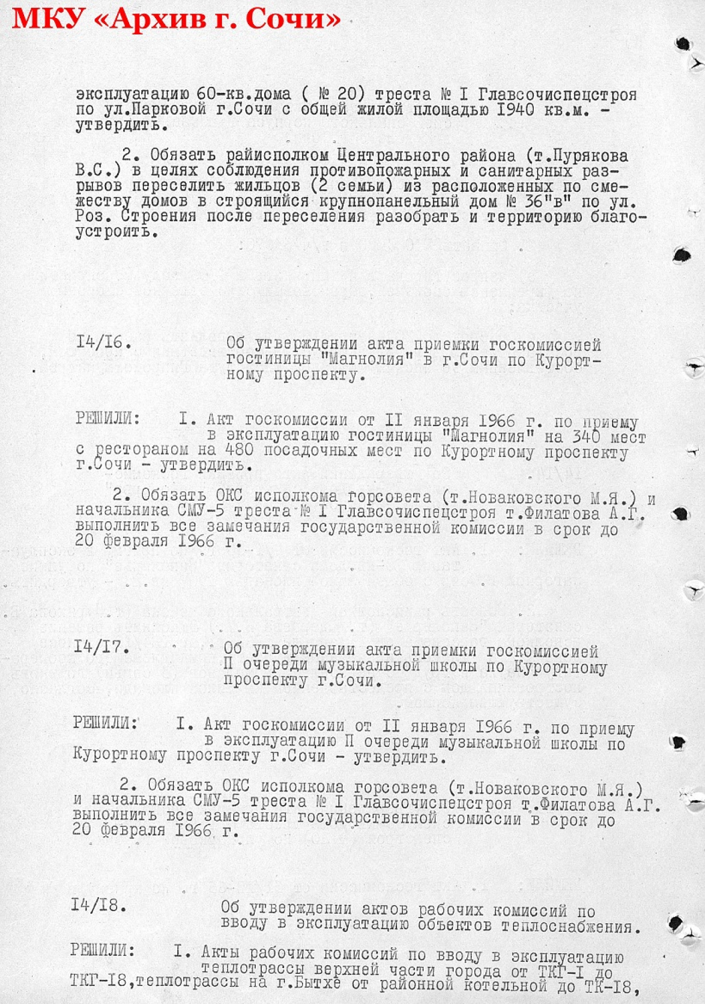 В январе 1966 года решением Сочинского горисполкома 14/16 был утвержден акт государственной комиссии по приему в эксплуатацию гостиницы «Магнолия» на 340 мест с рестораном на 480 посадочных мест.